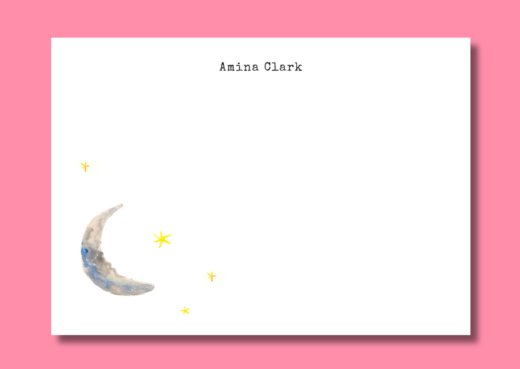 Hand drawn crescent moon on an A6 card, personalised with your name.